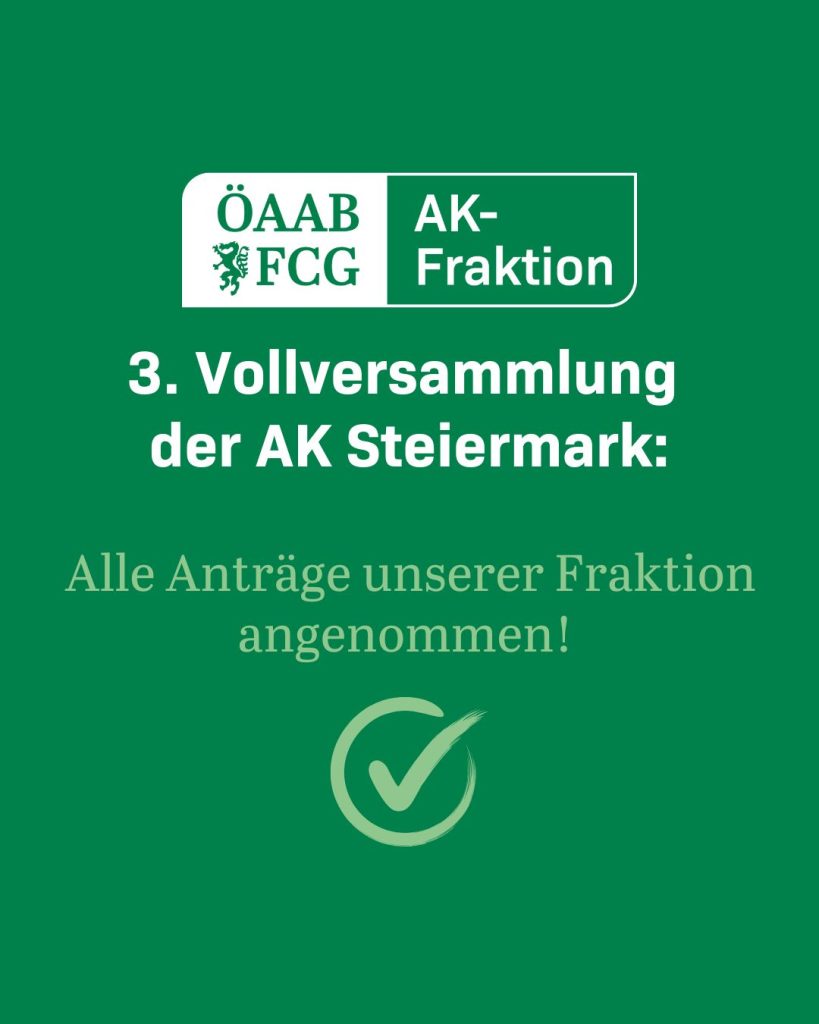 Am 08. Mai 2025 fand die 3. Vollversammlung der AK Steiermark in dieser Periode statt.  Alle Anträge der ÖAAB-FCG-Fraktion wurden angenommen.