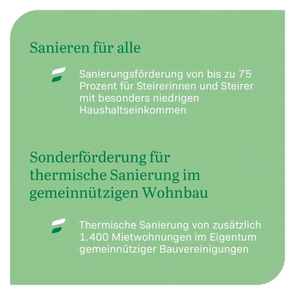 Von der Förderung junger Familien über die Unterstützung zur Errichtung und Sanierung eines Eigenheimes mithilfe günstiger Landesdarlehen bis hin zu attraktiven Förderungen für thermische Sanierungen und günstige Mietwohnungen können alle Steirerinnen und Steirer profitieren – egal wie sie wohnen.