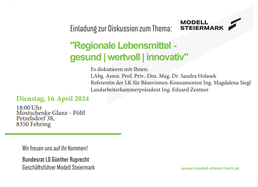 Im Rahmen des Modell Steiermark findet die nächste „Diskussionsveranstaltung“ zum Thema „Regionale Lebensmittel – gesund | wertvoll | innovativ“ mit