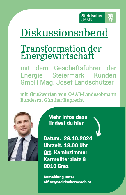 Der Steirische JAAB lädt zum Diskussionsabend zum Thema „Transformation der Energiewirtschaft“ ein. Es diskutiert mit Ihnen Energie Steiermark-Geschäftsführer Mag. Josef Landschützer.