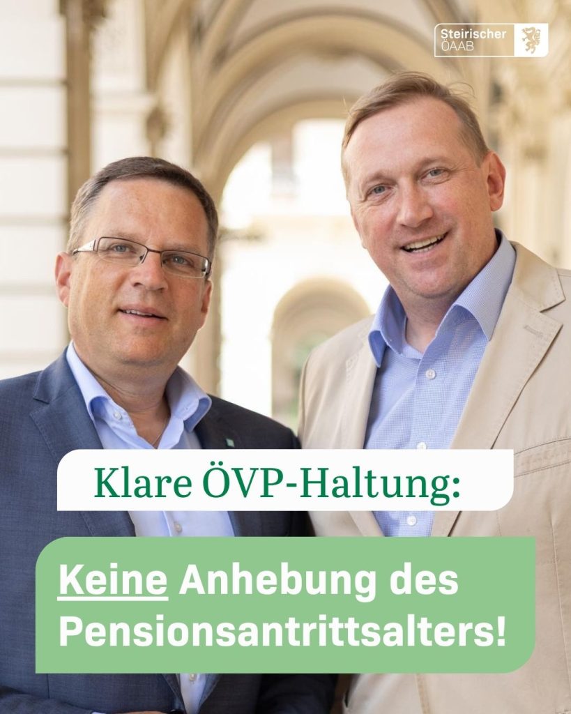 Auch ÖAAB-Landesobmann und Bundesratsvizepräs. Günther Ruprecht unterstützt diese Linie voll und ganz: „Wir stehen für Verlässlichkeit und halten, was wir versprechen. Statt das gesetzliche Antrittsalter zu erhöhen, setzen wir lieber auf Maßnahmen wie die neue Teilpension, um das FAKTISCHE Pensionsantrittsalter sozialverträglich anzuheben und so dem gesetzlichen anzugleichen. Gleichzeitig gibt es ein deutliches Signal: Wer länger arbeiten WILL, soll dabei unterstützt werden!“