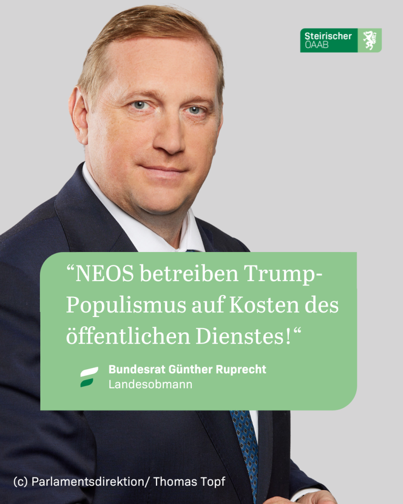 Landesobmann Ruprecht: „Und wieder einmal sind die Kolleginnen und Kollegen im Landesdienst schuld. Das ist purer Populismus auf Kosten des öffentlichen Dienstes, wie ihn auch Donald Trump betreibt. Anscheinend hat der US-Präsident mit NEOS seinen ersten steirischen Fanclub! Nachdem ihr Landessprecher schon bei den Berechnungen zum Landeshaushalt seine grobe wirtschaftliche Unkenntnis offenbart hat, wenden sie sich nun endgültig von sachlicher Politik ab!“