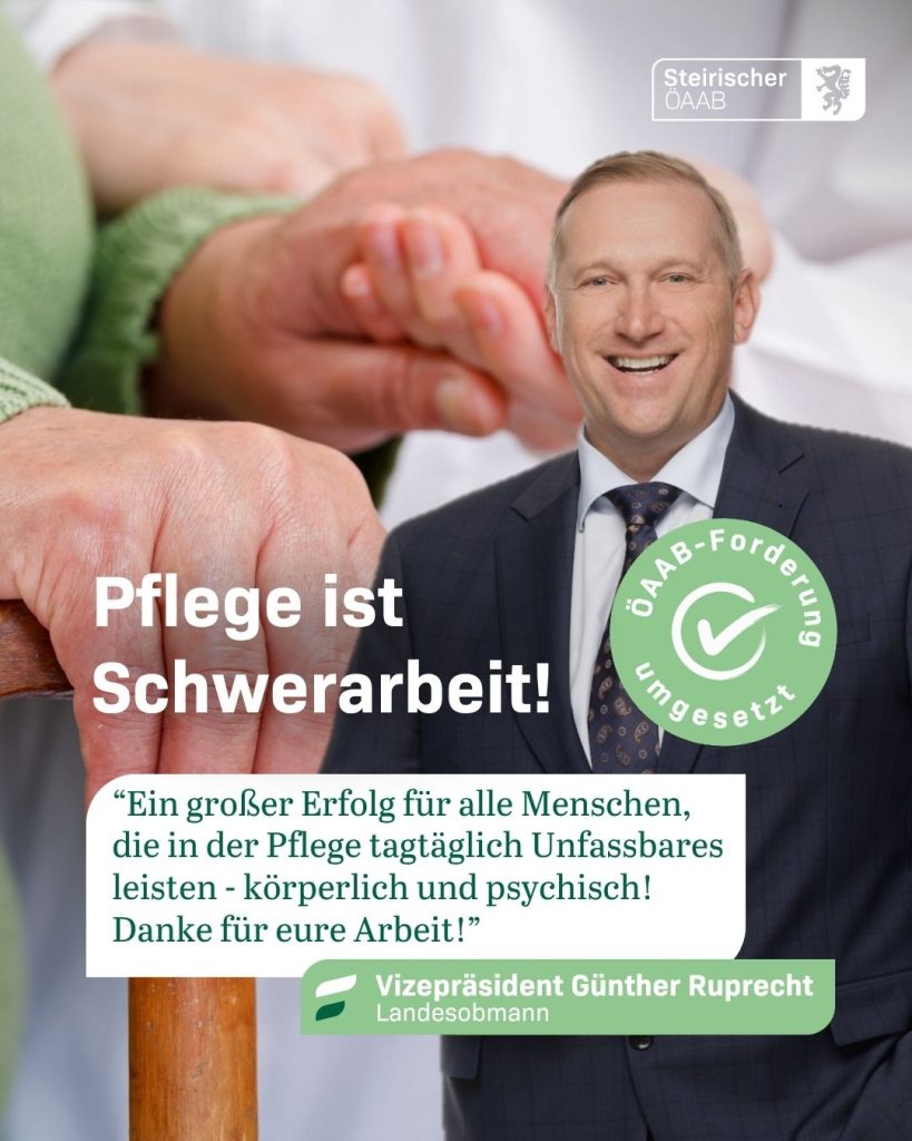 „Das ist ein politischer Meilenstein und ein großer Erfolg für die Kolleginnen und Kollegen in der Pflege, die täglich Unfassbares leisten. Wer über viele Jahre psychisch und physisch derart gefordert ist, hat die Schwerarbeitspension redlich verdient!“, betont ÖAAB-Landesobmann Vizepräsident des Bundesrates Günther Ruprecht.
