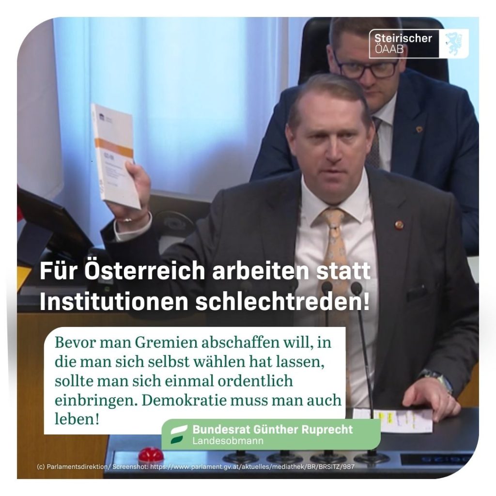 ÖAAB-Landesobmann Bundesrat Günther Ruprecht hob in seiner gestrigen Rede die durch die Sozialpartnerschaft und den Föderalismus hervorgebrachten Errungenschaften in Österreich hervor.