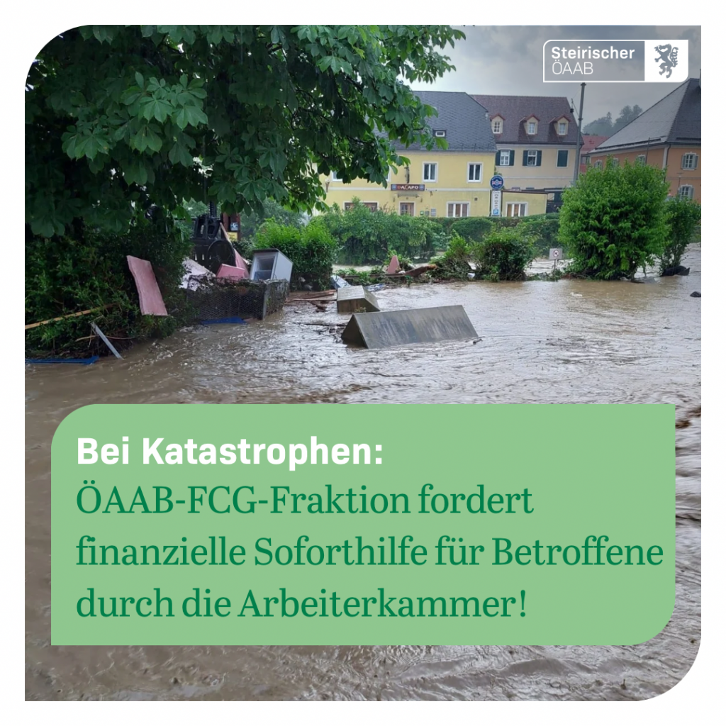 Die Unwetter der vergangenen Tage hinterließen in mehreren Regionen der Steiermark ein Bild der Verwüstung. Die ÖAAB-FCG-Fraktion in der Arbeiterkammer fordert AK-Präsident Josef Pesserl dazu auf, eine finanzielle Soforthilfe für betroffene AK-Mitglieder über die Arbeiterkammer anzubieten.
